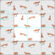 Handgemaltes Aquarellmuster entwarf durch Shelby Allison, der vier verschiedene Fuchscharaktere auf einem Winterhintergrund des schneebedeckten Weiß kennzeichnet.