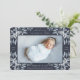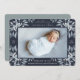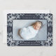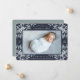 Elegante botanische Geburtsankündigung in schicken Blautönen mit einem Single voll bluten horizontalen oder landschaftsorientierten Foto mit Haufen von zarten staubblauen Aquarellfarben-Blätter und weißen Beeren an den Ecken, vor einem reichen marinen Hintergrund. Personalisieren Sie Ihre Daten mit dem Namen des Babys, den Geburtsstatistiken und einer persönlichen Nachricht, und fügen Sie drei zusätzliche quadratische Fotos hinzu.