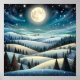 Eine ruhige Winterlandschaft entfaltet sich unter Vollmond-Glanz, mit sanften, schneebedeckten Hügeln, die von dunkelgrünen Bäumen übersät sind. Sterne blinken im tiefen Nachthimmel und fügen der friedlichen Szene eine magische Touch hinzu. Diese Fantasielandschaft besticht durch einen Vollmond, der eine im Winter verschneite Landschaft mit Hügeln, Bäumen und einem Sternenhimmel beleuchtet.