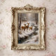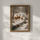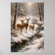 Drei Hirsche stehen neben einem stillen Waldstrom in einer schneebedeckten Winterlandschaft. Sanfte natürliche Töne und eine friedliche Waldatmosphäre schaffen eine ruhige jahreszeitliche Naturszene.