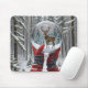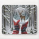 Paar rote Handschuhe, die in einer Winterwaldszene in einer Schneeglobe einen Buchhirsch hochhalten
