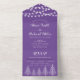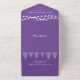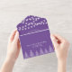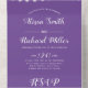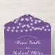 Bäume und Saitenlichter am lila Winter in einer Einladung zur Hochzeit. Es verfügt über weiße Bäume und Lichter mit Zeichenketten auf lila Hintergrund. Die Namen sind in der Skripttypografie, und der Riss von der RSVP-Karte kann gelöst werden.