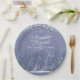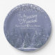 Winterhochzeit Pinienbäume See blaue Kunst Papier Teller. Winter Hochzeit blau-weiße Pinienbäume am See mit Schneegurken und Aquarelllien. Personalisieren Sie Ihre eigenen Hochzeitsdetails. Ideal für eine Weihnachtsfeier oder eine Winterhochzeit am See. © Original painting and design by Sarah Trett www.sarahtrett.com for www.mylittleedenweddings.com