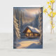 Eine gemütliche kleine Hütte in einem Hochland strahlt Licht über eine friedliche Schneewelt aus, wenn die Sonne über die Berge steigt. Eine schöne Urlaubskarte, ideal für alle, die die Natur und die Natur im Freien Lieben.