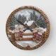 Eine charmante Holzhütte inmitten von schneebedeckten Kiefern sorgt für eine ruhige Winteratmosphäre. Weiche weiße Flocken fallen sanft ab, während ein warmes Feuer im Kamin brennt und das gemütliche Gefühl verstärkt.