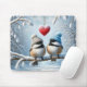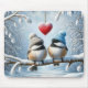 Zwei Hühnervögel tragen auf schneebedeckten Zweigen gemütliche Huthölzer mit einem roten Herz über ihnen und umgeben von einer Winterlandschaft