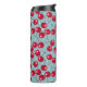 Winterkirsche. Rote reife Kirschbeeren auf grautürkisfarbenem Hintergrund mit weißen Punkten.