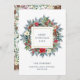 Diese wunderschöne Weihnachtskarte bietet einen schönen Urlaubskurz im Aquarellstil mit grünen Kiefernbäumen, Blätter und Ästen, Weihnachtsbeeren, Kiefernbäumen und rot-cremefarbenen Blume auf winterweißem Hintergrund. Ein quadratischer Rahmen mit einem eleganten Imitat Goldrahmen ist in der Mitte, zusammen mit dem Feiertagsgruß Ihrer Wahl.