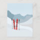 Abstrakte Winterlandschaft mit Panoramablick auf die Berge, rote Skiausrüstung, Pfad und Himmel
