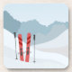 Abstrakte Winterlandschaft mit Panoramablick auf die Berge, rote Skiausrüstung, Pfad und Himmel