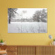 Eine ruhige Winterlandschaft mit schneebedecktem Gelände mit spärlicher Vegetation, die durch den Schnee schlängelt. Im Hintergrund ist eine Gebirgskette teilweise von Wolken verschleiert. Bäume säumen den Rand des Feldes, ihre Äste mit Schnee beladen. Die Szene ist einfarbig, von Weiß- und Grautönen dominiert, was eine friedliche und kalte Atmosphäre schafft.