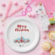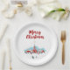 Papier Teller mit einem digitalen Bild einer bemalten Abbildung einer roten Kirche und Steile. Ein heller Weihnachtsstar, der über der Decke leuchtet. Familien vor dem Haus, die für einen Gottesdienst anreisen. Winterschnee bedeckt den Boden und Erholungen auf niedlichen Buschkiefern. Fröhliche Weihnachten in einem trendigen roten Schriftart,
