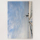 Foto-Puzzle eines minimalistischen Ausblicks auf eine Winterlandschaft in Holland mit einem Pfad und einem Kanal zu einer Windmühle unter einer Schneeschicht mit schönen Wolken bei Sonnenaufgang in der niederländischen Landschaft.