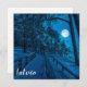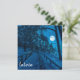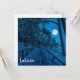 Winterlandschaft mit schneebedeckten Kiefern und Tannenbäumen in einem Mondlicht bei Sternennacht mit Vollmond. Aussicht auf Nadelwald mit Holzweg an der Küste mit schönem Nachthimmel mit Sternen