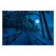 Winterlandschaft mit schneebedeckten Kiefern und Tannenbäumen in einem Mondlicht bei Sternennacht mit Vollmond. Aussicht auf Nadelwald mit Holzweg an der Küste mit schönem Nachthimmel mit Sternen