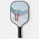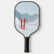 Abstrakte Winterlandschaft mit Panoramablick auf die Berge, rote Skiausrüstung, Weg und blauer Himmel.