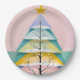 Eine lebendige, stilisierte Komposition, die einen Weihnachtsbaum in einer abstrakten, geschichteten Landschaft darstellt. Das Kunstwerk zeigt einen deutlichen, dunklen zentralen Baumstamm und kahle, schneebestäubte Äste, die sich über horizontale, dreieckige Farbflächen erstrecken. Diese in sanften Pastelltönen von Rosa, Helllila, Türkis und Gold gehaltenen Schichten deuten auf schneebedeckte Terrassen oder eine ätherische Bergkette hin. Ein heller, goldener, fünfzackiger Stern krönt die Spitze. Die Oberfläche hat eine reiche, texturierte Qualität, als ob sie mit dicker Paste oder Gouache gemalt worden wäre. Goldene Akzente heben kleine, leuchtende Kugeln hervor, die über die Äste und innerhalb der farbenfrohen Schichten verstreut sind und festliche Ornamente oder Winterlicht suggerieren