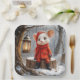Eine niedliche Maus in einem warmen, roten Outfit sitzt auf einem Baumstumpf, umgeben von einem schneebedeckten Wald