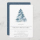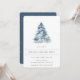 Arktische Winterblauer mattierter Kiefernbaum, Feiertagseinladung. Kartenfunktionen, weiche graue Typografie und weißes Schneeflottmuster auf blauem Hintergrund.