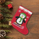 Ein niedlicher schwarz-weißer Pinguin steht auf seinem Schlitten auf diesem Strumpf. Er trägt eine weihnachtgrüne Weihnachtsmannmütze und einen Schal und ist auf einem hellroten Hintergrund platziert. Zwei verzierte weiße Schneeflocken treiben um ihn herunter. Der Name Ihres Kindes ist grün auf einer weißen und roten Spitze des Strumpfs. Spaß für einen Jungen oder ein Mädchen während der Ferien und personalisiert nur für sie!