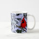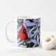 Ein wunderschöner Roter Kardinal, der zwischen schneebedeckten Winterhalbkugeln ruht.