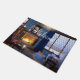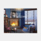 Eine gemütliche Leseecke an einem schneebedeckten Wintertag, an dem eine Ingwer-Katze am brennenden Feuer sitzt. Rund um den Saal stehen bequeme Sessel mit Kerzen und Bücherstapeln und eine dampfende Tasse, um den Komfort zu vervollständigen. Außerhalb einer frostbedeckten Weide und Buche Hecke verschleiert durch den fallenden Schnee.