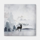 Ein Magnet mit einem Aquarellbild mit einem Rentier aus schwarzer Silhouette, der unter einigen Kiefern stehend ist. Graues Schwarz-Weiß-Farbschema mit neutraler Farbe.