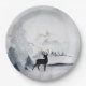 Papier Teller mit einem Aquarellbild mit einem Rentier aus schwarzer Silhouette, stehend unter einigen Kiefern. Graues Schwarz-Weiß-Farbschema mit neutraler Farbe.