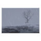 Eine kalte und windige 3D-Landschaft im Winter, geschaffen in Vue. Auf einem Hügel weiß mit Eis und Schnee, gegen einen stürmisch grauen Himmel mit Regen oder stetig fallendem Schlitten steht ein einsamer, nackter Ahornbaum mit einer Holzbank darunter.