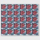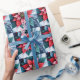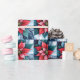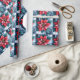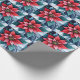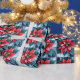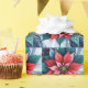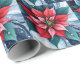 Lebhafte rote Poinsettia-Blume mit zarten rosa Farbtönen im Zentrum jedes Blütenblattes. Es ist Set vor einem coolen Hintergrund, das eine winterliche Szene mit wirbelnden, weißen Mustern, die Windböen ähneln, hervorruft.