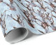 Das Winterschnee-Szene-Design zeigt das Bild eines Waldes von kahlen Bäumen während des Winters mit Schneeflocken bedeckt. Der Hintergrund ist blass blau.