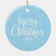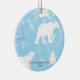 Personalisierte Weihnachtsschmuck mit niedlichen Eisbären mit abfallenden Schneeflocken auf eisblauem Hintergrund mit Familienname und Jahr in einem klassisch grauen Schriftart. Die Rückseite zeigt Frohe Weihnachten in einem Skript-weißen Schriftart mit dem Jahr auf einem passenden eisblauen Hintergrund.