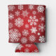 Eine Dose kühler mit rotem Hintergrund und weißen Schneeflocken und Sternen. Die Schneeflocken sind in verschiedenen Größen und Formen erhältlich, und sie sind überall auf der Dose kühler verteilt. Die Sterne sind auch weiß, und sie sind kleiner als die Schneeflocken. Der Dosenkühler ist aus weichem, flexiblem Material.