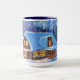 Tasse für Kaffee, Tee, heiße Schokolade, Milch oder Saft. Mit niedlichen Dezember Winter Holiday Szene von einer Blockhütte in einer schneebedeckten Waldlandschaft und einem Weihnachtsbaum mit bunten Lichtern und Ornamenten dekoriert.