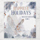 Eine wunderschöne Aquarellbild mit einer Waldlandschaft, die in der Ferne Tannen und schneebedeckte Kiefernbäume im Vordergrund hat, die eine Grenze um personalisierte Vorlagen bilden. Eine schöne Scheuneneule fliegt über silbergraue Blätter mit orangefarbenen Beeren. Der Wortlaut, der aus dem Namen Ihrer Familie "Happiest Holidays" lautet, kann auf jeden Gruß Ihrer Wahl geändert werden.