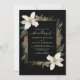 Winterkiefernkegel und weiße Blume auf schwarz mit eleganter Script-Einladung zur Hochzeit.