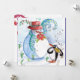 Whimsikale, farbenfrohe, pastellfarbene Malerei in blauen Rottönen, Schneemann und Pinguin im Winterschnee mit roten Blume,Schnörkel.von Bulgan Lumini (c)