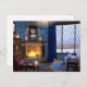 Eine gemütliche Leseecke an einem schneebedeckten Wintertag, an dem eine Ingwer-Katze am brennenden Feuer sitzt. Rund um den Saal stehen bequeme Sessel mit Kerzen und Bücherstapeln und eine dampfende Tasse, um den Komfort zu vervollständigen. Außerhalb einer frostbedeckten Weide und Buche Hecke verschleiert durch den fallenden Schnee.