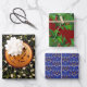 Drei verschiedene und wunderschöne Verpackungspapiere für das Weihnachten und die Wintersaison. In diesen Festpapieren finden Sie keltische Spiralen, umgeben von Mistelosen auf dunkelgrünem Hintergrund, heilige Kränze auf einem tiefen Maroon-Hintergrund und metallische Pentagramme auf einem eisblauen Hintergrund.