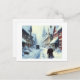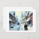 In einer schneebedeckten Straßenszene spazieren Sie mit einem Stock, umgeben von schneebedeckten Gebäude und einer weit entfernten, von Pferden gezeichnet Kutsche. Das weiche Licht kommt aus den Fenstern und schafft eine gemütliche, Vintage Atmosphäre.