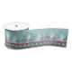 Winterbild mit Kiefernbäumen und Schneeflocken auf blau, rot und weiß gestreiftem Hintergrund
