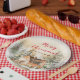 Diese schöne und festliche Aquarellplatte kann mit Ihrem Familiennamen personalisiert werden. Es verfügt über eine rustikale Hütte, umgeben von Schnee und Bäumen. Es gibt bezaubernde Tiere, wie Elche und Hundshunde, aber auch Blattwerk. Der Text kombiniert handgeschriebene Skripte mit serifenlosen Schriftart für ein stilvolles und modernes Design. Das ist perfekt für Weihnachten-Party.