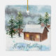 Dieses Design zeigt eine Illustration des Winterwaldes - Kiefernbäume, Reh und Blockhütte, verschneit