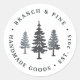 Rustikale, schicke Aufkleber für Ihr Outdoor-, Abenteuer- oder naturorientiertes Geschäft verfügen über ein Trio aus blauen und grauen Pinienbäumen mit zwei individuellen Textfeldern in einem abgerundeten Runddesign.