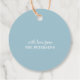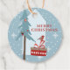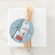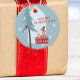 Moderne trendige, saisonale, runde Geschenktafelumschließung in staubblau und weiß mit abfallenden Schneeflocken und einem Weihnachtsbaum mit Ornamenten und einer roten Geschenkboxen.++++++++++ Persönliche Gestaltung mit Text und Unterschrift!