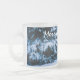 Schneebedeckte Fichten im Wald. Frisch weißer Schnee, blau und grün, Winterstimmung. Frohe Weihnachten und viel Glück für Sie und Ihr neues Jahr! Text Frohe Weihnachten. Sie können den Text ändern.