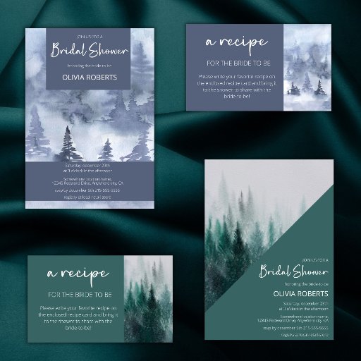 Rustikales Waldland Brautparty Design mit Aquarell rauchiger Winterwald und moderne Typografie Layout mit eleganten Schriftart. Der Text kann leicht für ein einzigartiges Design für Ihren besonderen Tag personalisiert werden