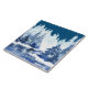 Keramik im Winterwald. Bild der Bäume, die nachts mit Schnee bedeckt sind, neben einem Fluss.