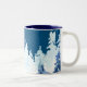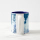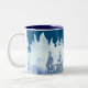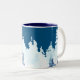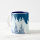 Im Winterwald gibt es eine Zwei-Tone-Kaffee-Tasse. Bild der Bäume, die nachts mit Schnee bedeckt sind, neben einem Fluss.