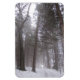 An einem nebligen Wintertag geht es auf einem schneebedeckten Weg durch den Wald.